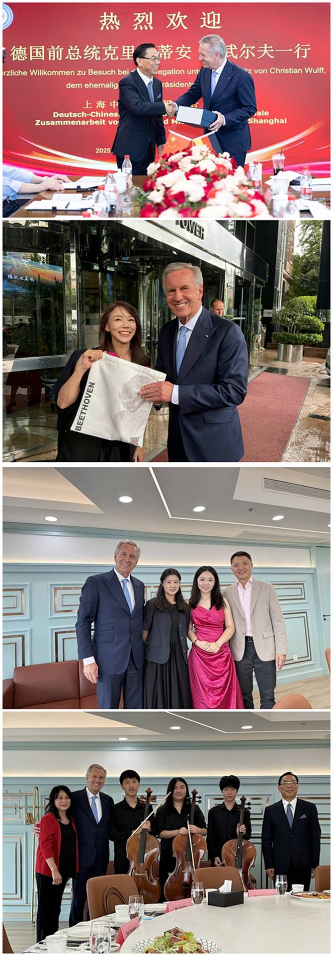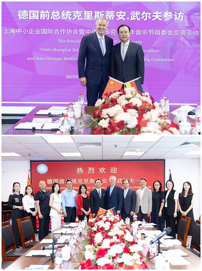 2025年9月23日,秋意初显,音乐传情。贝多芬青少年音乐节荣誉主席、监护人德国前总统克里斯蒂安·武尔夫先生到访与中德贝多芬青少年音乐节组委会、上海中小企业国际合作协会进行友好交流。此次活动以音乐为纽带,深化中德人文互动,进一步推动两国在文化、教育及中小企业合作等多领域的密切联系。