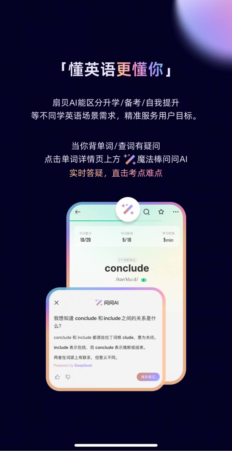 •内置口语跟读评分系统,采用神经网络算法兼容英美式口音,从流利度、准确度等多维度实时打分,实现“背词+口语练习”同步高效;