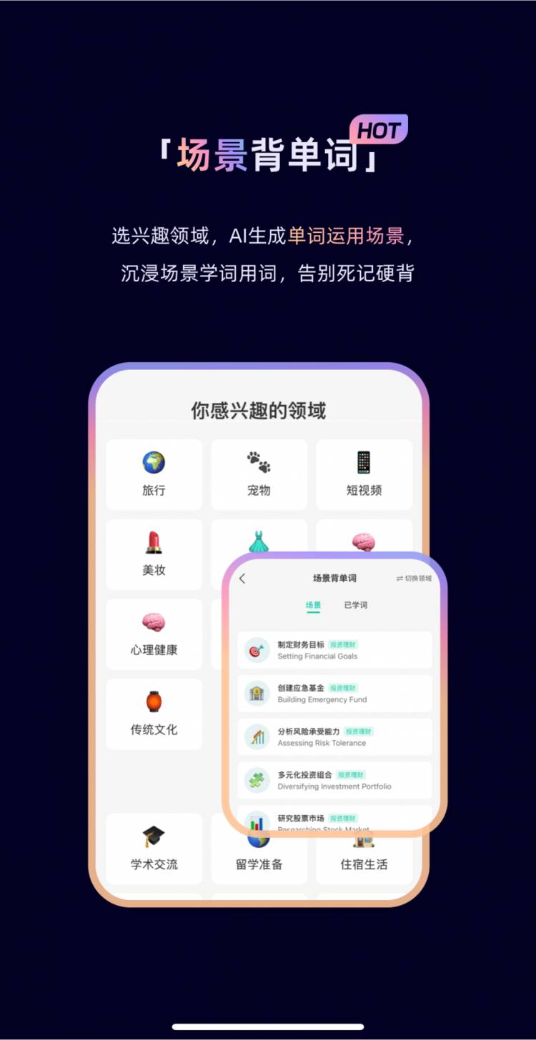 •场景化关联记忆与即时口语练习,强化单词应用能力,延长记忆留存周期。