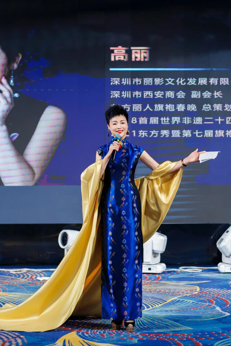 在庄重而温情的致辞环节,丽影文化创始人高丽女士深情回顾了品牌的创业初心。这位从古都西安奔赴深圳追梦的女性创业者,娓娓道来八年来以旗袍为媒、践行“用美赋能生命”的执着心路历程。她坦言,最初的愿望朴素而坚定——让每一位平凡女性都能被看见、被尊重、被照亮,在属于自己的舞台上熠熠生辉。